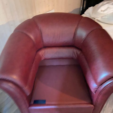Stolen har fire forskjellige stillinger. Vi selger den fordi det skal bli en dør der stolen står i dag. Vi har to av disse stolene som står på hytta vår. Denne er nesten ubrukt. Ny pris for stol og puff er 8960,-