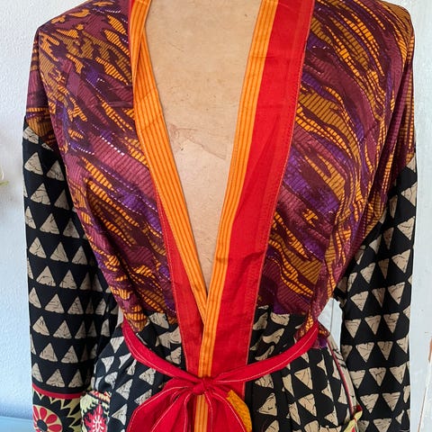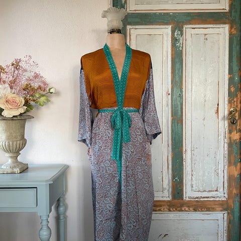 Kan brukes som morgenkåpe eller over en kjole til fest for å gi litt liv! 🦚laget av en silkeblanding 💘 Noen løse tråder men den er helt nydelig 🪷 laget i lett og tynt stoff ❤️ #sommer #fargerik #hippie #unik #spesiell #festival #luksus #sarie #redesign #mønster #alvisk #indisk #luksus #cottagecore #kimono #morgenkåpe #jakke #rød #bridgerton #pink #sommer #festival #omslag #bohem #unik #mønster #silke #design #kunst #cottage #orange #dansk #mote #omslag