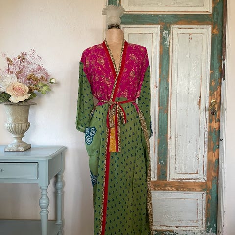 Kan brukes som morgenkåpe eller over en kjole til fest for å gi litt liv! 🦚laget av en silkeblanding 💘 Noen løse tråder men den er helt nydelig 🪷 laget i lett og tynt stoff ❤️ #sommer #fargerik #hippie #unik #spesiell #festival #luksus #sarie #redesign #mønster #alvisk #indisk #luksus #cottagecore #kimono #morgenkåpe #jakke #rød #bridgerton #pink #sommer #festival #omslag #bohem #unik #mønster #silke #design #kunst #cottage #orange #dansk #mote #omslag