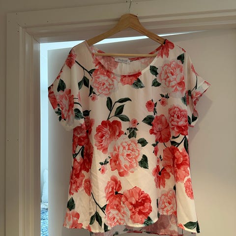 Flott bluse i 100% viskose, følger med topp i offwhite til å ha under, 3/4 lang erme med smal kant og knapp nederst. Brukt et par ganger og fremstår som meget pen. Str 40