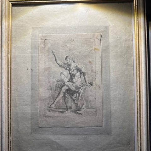 Gammel innrammet broderiprøve / navneklut / sampler. Litt bleket men veldig sjarmerende. Signert og datert 1848. Rammemål 47 x 43 cm.