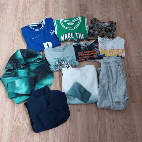 Bilde 1: 2 t-skjorter fra levis str 10 år, 1 fra champion str 140. 1 shorts fra Jack n Jones str 140, 1 fra gullkorn. 2 siste shortser fra hm. Klærne er hele, pent brukt. Alle str 140. Selges kr 300.