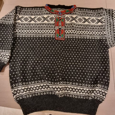 Genseren er strikket i garnet Heilo og etter mønster fra Vestlandskofta, Dale of Norway. Størrelse ca XL dame. Mangler 2 knapper på ene ermet. Kan bestilles. Genseren er håndstrikket på 1990-tallet og pent/lite brukt. Har også knestrømper i str. 38-39 i samme mønster - ubrukt. Ta kontakt hvis nøyaktige mål ønskes.
