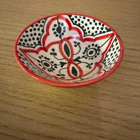 Selger en nydelig ubrukt håndlaget marokkansk bolle i keramikk. Den har et rikt blått mønster med tradisjonelle detaljer og er både dekorativ og funksjonell. Perfekt som fruktbolle, serveringsbolle eller bare som et unikt blikkfang i interiøret.