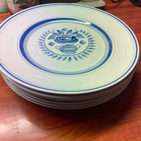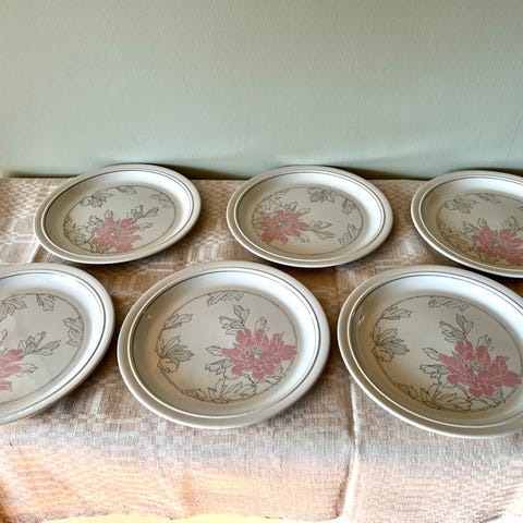 Sjarmerende tallerkener med blomsterdekor og gullkant fra finske Arabia. Diameter 19,8cm, slik at de passer til frokost. Stempelet under tallerken ble benyttet i tiden 1964 - 1971. Normal aldersrelatert slitasje, de kan være 55-60 år gamle: Avslitt gulldekor flere steder, små riper etter bruk og muligens et lite hakk/uregelmessighet i gulldekoren langs kanten på den ene. Alt i alt veldig skjønne og har flere års bruk foran seg. Selges samlet for kr 150.