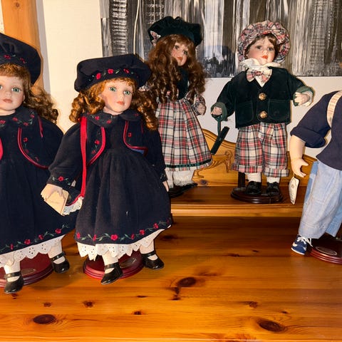 Dukke, ukjent årstall, men var barneleke til en som er født på tidlig 1950-tall, så trolig ca 70 år gammel. Kjolen av samme årgang. Veldig fin dukke, men med et løst ben som avbildet. Er nok best egnet for utstilling/til en samling.