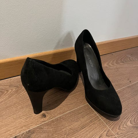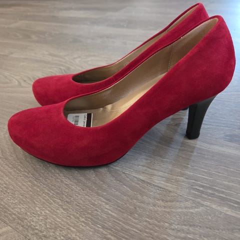 Fine røde høyhælte sko selges da de bare står i skapet. Brukt et par ganger. Stoffet er av velur.