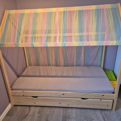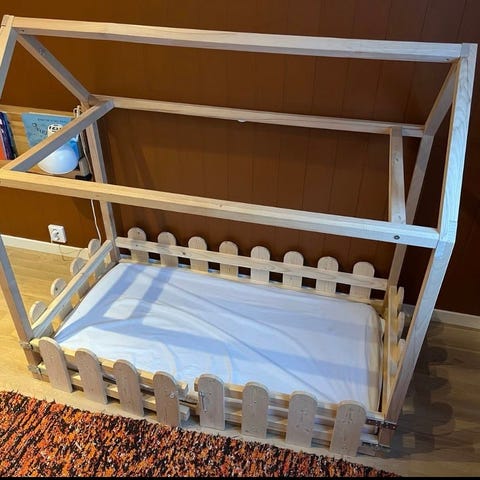 Selvbygd barneseng med solide materialer i 1,5x3”ramme og 1,5x8”i bunnen.