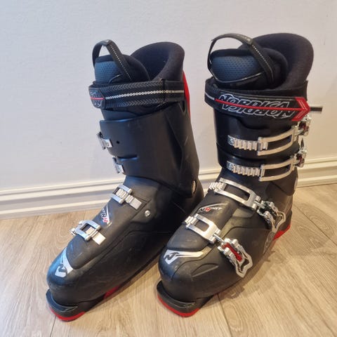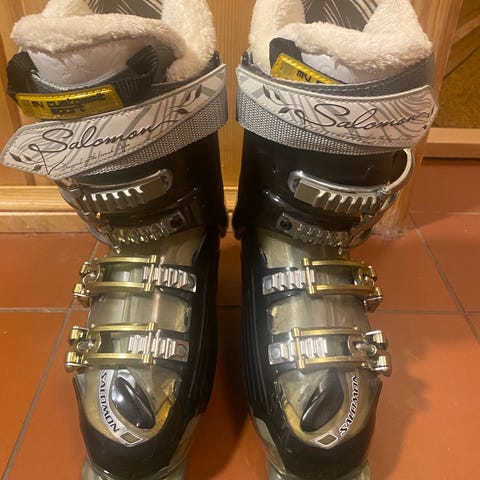 Lite slitasje på såler, pene og hele spenner, ingen sprekker i plasten. Oppbevart tørt.