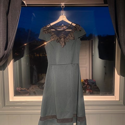 Uk str 12, er som en vanlig m, både i over og underdel. Her trengs det ingen smykker, kjolen er nok i seg selv. Selges da den har krympet i skapet 😩