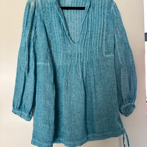 Nydelig Linbluse/tunika med 3/4 ermer og bukse 3/4 lengde og glidelås i siden - fra 120% Lino (Italy) kjent for topp kvalitet. Denne linen holder seg like myk over tid. Lite brukt. Ingen flekker eller andre bruksmerker. Selges samlet.