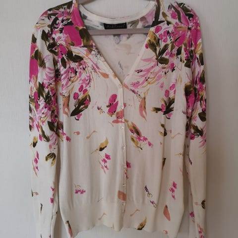 Pen cardigan i str m. Merke noisy may. Pent brukt. Varm og behagelig å ha på. Grålig farge, lang. 50 prosent bomull, 50 prosent acryl.