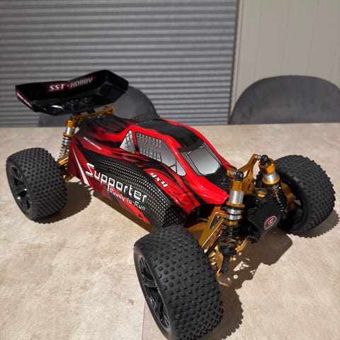ECX Revenge buggy type-e. Denne fjernstyrt bilen har firehjulsdrift med en toppfart på 60 km/t med de grå vanlig batteriene. Det hvite batteriet har en toppfart på 100 km/t. Lader, batteri og brannbag til batteri følger også med. Denne bilen er utrolig gøy å leke med og har en utrolig akselerasjon. Det er en sprekk på toppen av bilen på plasiken det har ingen teknisk betyding.