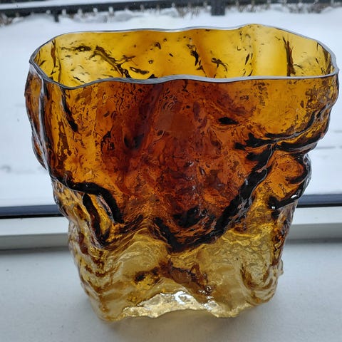Veldig spesiell vase formgitt av Bertil Vallien for Kosta Boda. Fantastisk fargespill i blått, gult og rosa gjør at at vasen har fantastiske dekorasjons egenskaper. Hodet av en mann i fronten forsterker inntrykket. Den er som ny. H - 30 cm, B - 13 cm.