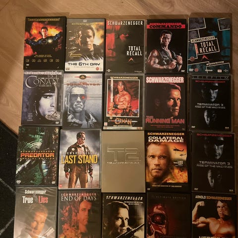 4 filmer , RUNNING MAN . PREDATORER spesial 2 disk edition.SANNE LØGNER . Og the LAST STAND 60kr . Alle diskene er strøkne og ripe fri . selger alle 4 filmer for 160kr . Selges. Med fiks ferdig .