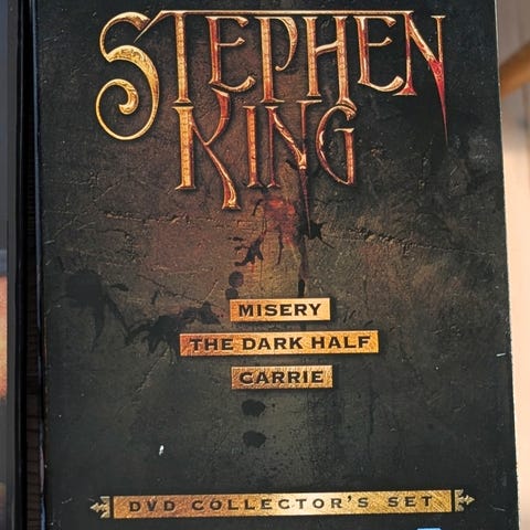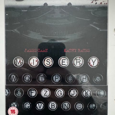 "Misery" fra 1990 på DVD med norsk tekst tilgjengelig. Filmen er basert på Stephen King sin roman fra 1987 med samme navn. Dansk cover.