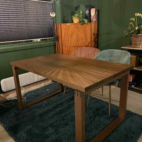 Mål på bord: Lengde 220 cm. Total bredde inkl. ben 106 cm (platebredde 98 cm). Høyde 75 cm. Klaring under bordet 72 cm.
