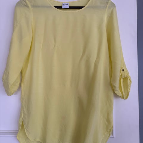 Nydelig gul topp fra franza. Str m. Knapper ved skuldrene, lett og behagelig å ha på. Som ny, brukt en gang.