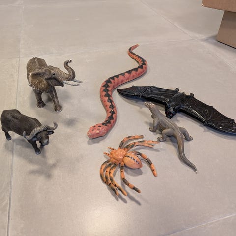 Selger en sett med lekedyr, insekter og amfibier. Har vært med i mange fine fantasifulle barneleker. I god stand, ingen skader.