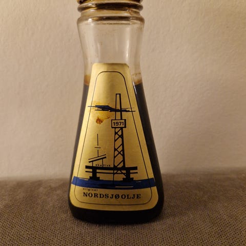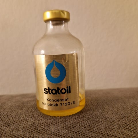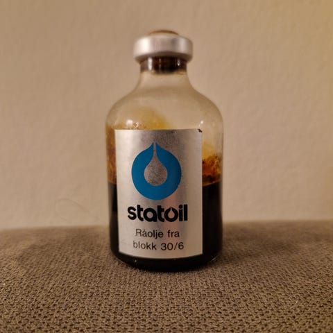 2 små oljeflasker med etikett fra blokk 30/6. Flaskene inneholder råolje og er merket med Statoil-logoen. Egnet for samlere eller som et historisk objekt.