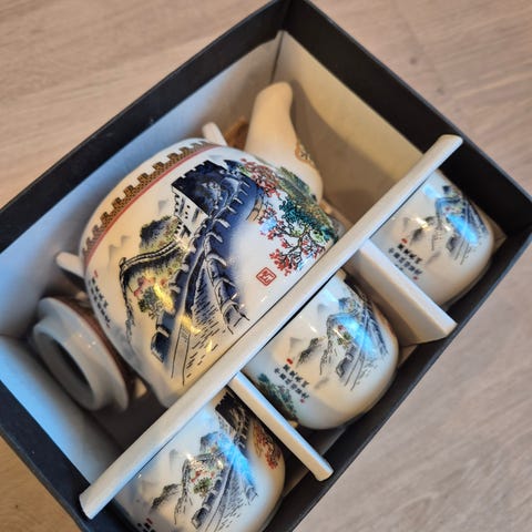 fint tesett i porselen formet som mandarin. Inkludert reiseetui. Kinesisk porselen