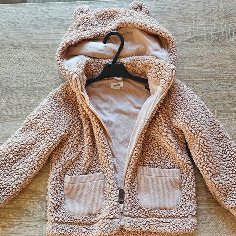 Selger søt, rosa teddyjakke fra Newbie KappAhl. Hette, glidelås og lommer.