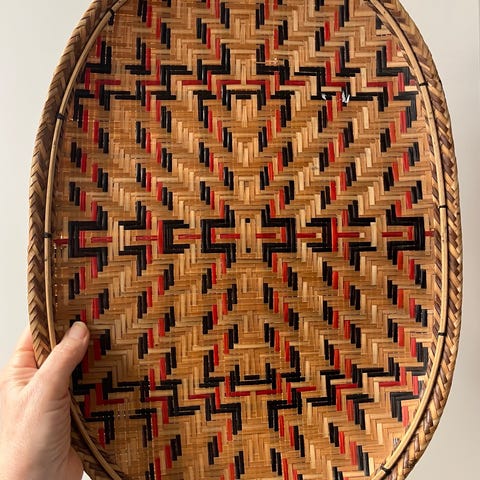 vintage retro hånd laget håndlaget håndflettet håndvevd vevd håndarbeid arbeid serveringsbrett serveringsfat hand woven hand-woven pizzakurv pizzabrett pizzafat rød pil brød