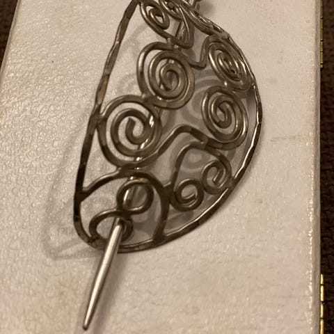 Pen og dekorativ nål med svart sten. Fin som hattenål eller pynt på genser, jakke eller annet plagg. Ca 11,5 cm lang.