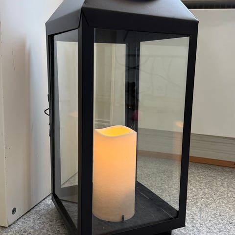 Stor lykt, høyde: ca 55 cm, bredde: ca 22 cm, forseggjort i tre og metall.