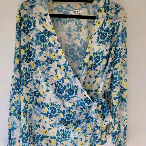 Hvit omslagsskjorte med blomstermotiv i blått og grønt fra Vince Camuto. Skjorten har knapp som holder den innerste delen av skjorten på plass. Den kan justeres i to lengder. Den ytterste delen knytes. Det er også en liten knapp som holder utringningen på plass.