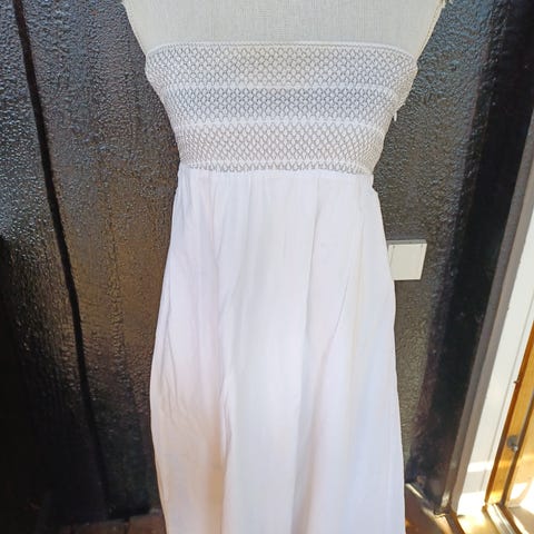 Kjolen er kjøpt i Cannes og er nærmest ubrukt. Kan brukes med og uten belte. Helforet-skrukker ikke. Lengde:99 cm, brystvidde 92 cm.