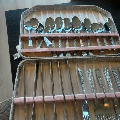 Består av fem deler i rustfritt stål og ligger i en elegant boks med hvit silke og rød fløyel.