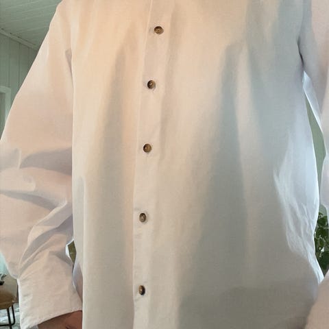 En enkel og behagelig hvit skjorte i størrelse S, som passer til mange anledninger. Skjorten er pent brukt og trenger bare å strykes for å se fresh ut igjen.