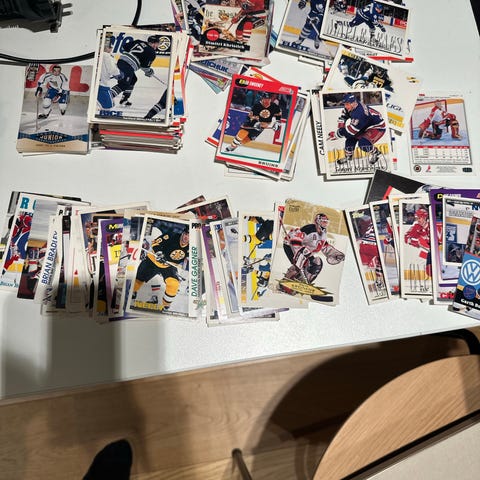 Selger 27 stk. forskjellige Ishockey kort, fra 8 forskjellige serier. Det er 23 base kort, 1 die cut og 3 insert blandt kortene. Kortene er I god kvalitet. Selges som på bildene. Sender med kortholder mappene. Selger for 50kr.