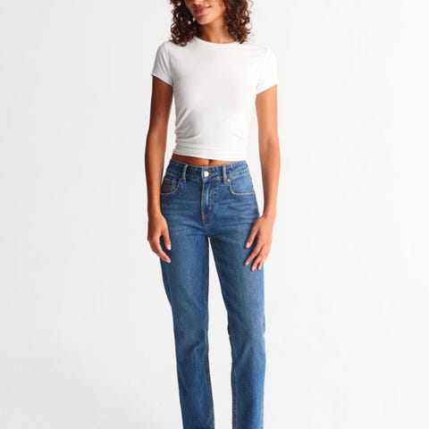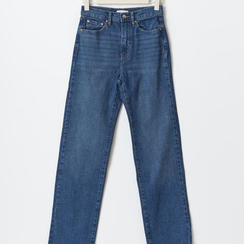Rette jeans med medium høy midje. Jeansene er svartgråe og har bein med normal lengde. Stretchy kvalitet og lommer foran og bak. Siste bilde viser hvordan buksen ser ut da den er avklipt nederst og har en cropped look.