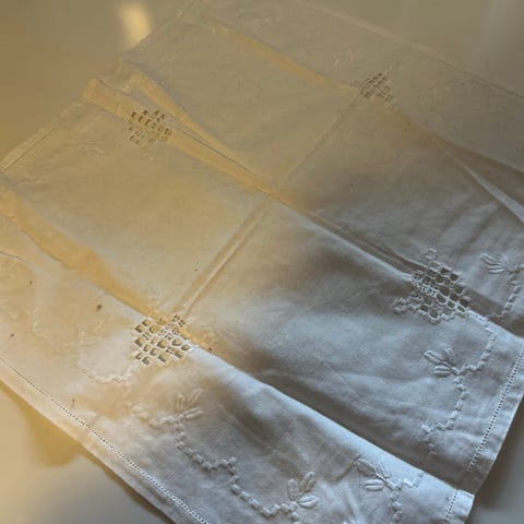 Håndbrodert. Sett med liten løper (28x56 cm) og 2 små brikker (28x28 cm). Lys, lys rosa lin med broderier i hvitt. Kommer fra arvebo. Ser ubrukt ut. Har ligget så lenge at løperen og en brikke har fått et brunskjær ved bretten på midten.
