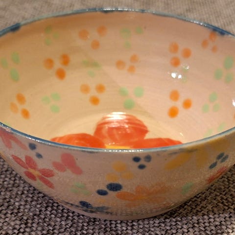 Nydelig håndreid bolle /skål i keramikk i grå/beige farge med dust blomstermønster på innsiden. Har bare stått til pynt, så som ny. Perfekt til frukt eller salatbolle. Mål 24Ø og 12 cm høy.