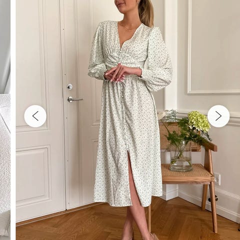 Vakker lang kjole i lilla mønster med lange ermer. Kjolen har V-hals og knapper helt ned foran for lukking.