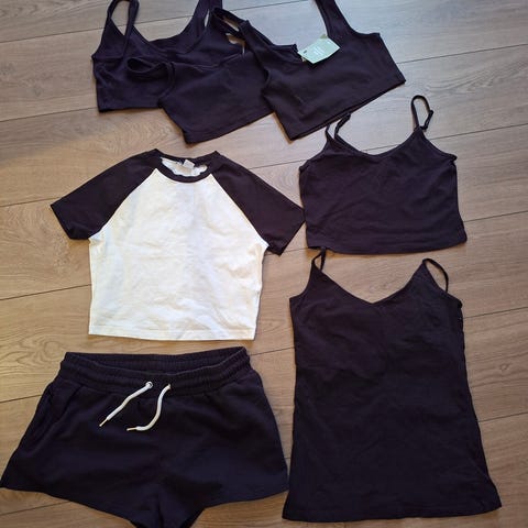 Ubrukt Vila bomull singlett med regulerbare stropper, og fin blonde nede. Hm 3/4 lange ermer, T-skjorte i fargen koksgrå laget av bomull. Shorts med strikk i livet og snøring, laget av lyocell. 2 gode lommer.