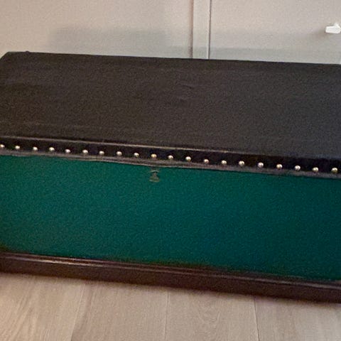 Gammel skipskiste i god stand antageligvis fra skipsfarten mellom Norge og Amerika på slutten av 1800-tallet. Se bilde av handelsflagg.