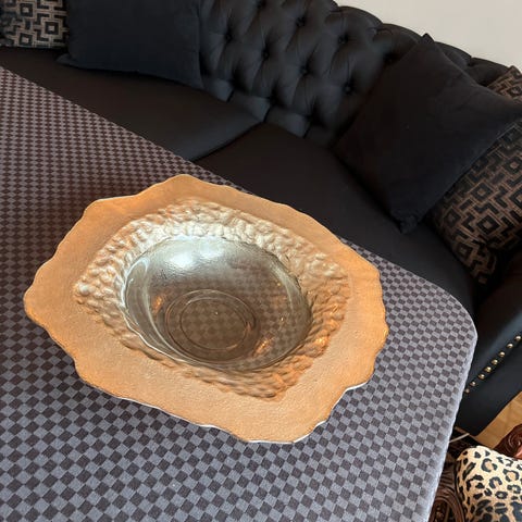 Massivt sølvfarget fat til pynt, lys, frukt eller det du måtte ønske.