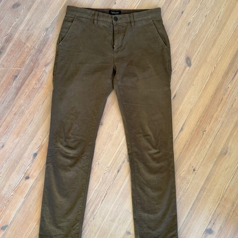 Klassisk chinos fra FRAM (modell Richard), laget i 100 % bomull. Farge: brungrønn. Str. 30/32. .