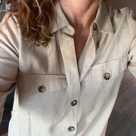 Luftig , overzized og god kjole fra merket Fransa. Str S, passer godt en M. Liten knapp bak i nakken. Godt stoff , kjennes som lin, men er viscose og nylon. Noen av Bildene avviker litt i fargen , kjolen er helt sort.
