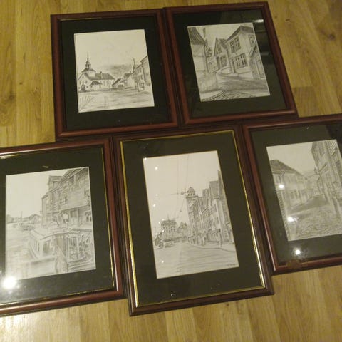 Det er fem motiver i denne samlingen som jeg har av tegneren Olav Normann. Uvisst hvor mange han egentlig lagde den gang. Når en ser på bildene så er det en bildetekst påskrevet hvert enkelt bilde. Beskrivelsen står til hvert enkelt av fotoene i annonsen. Bildene er glassinnrammet, og har lagt på loftet i mange, mange år. Ved avfotografering noe nedstøvet - vil bli rengjort før levering til kjøper. Noen av trerammene er lett ripet.
