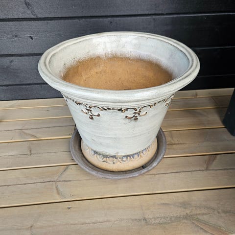 Stor solid keramikkrukke til utebruk med drenereingshull i bunnen.