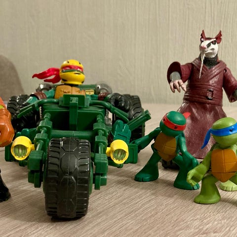 To ninja turtles figurer med utstyr, og en Ninja Turtles ATV selges.