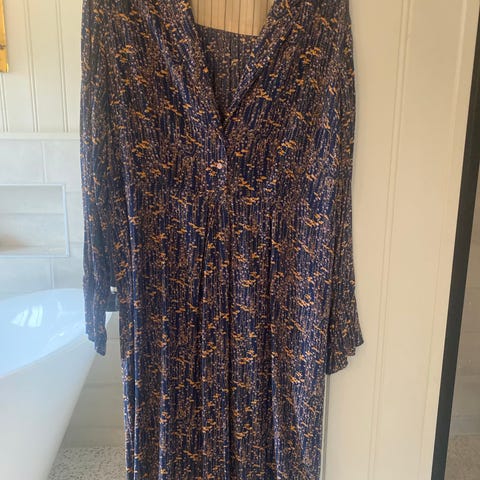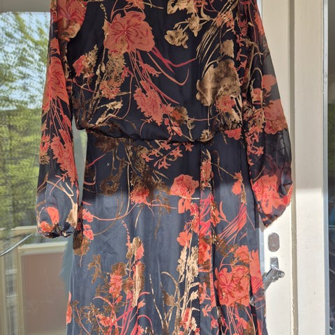 Vakker kjole som er i flere lag i hoveddelen, flatterende over mage og hofter, splitt foran, ankelsid, mønster i jordfarger med gull-spots. Normal L. Passer til fest hele året!