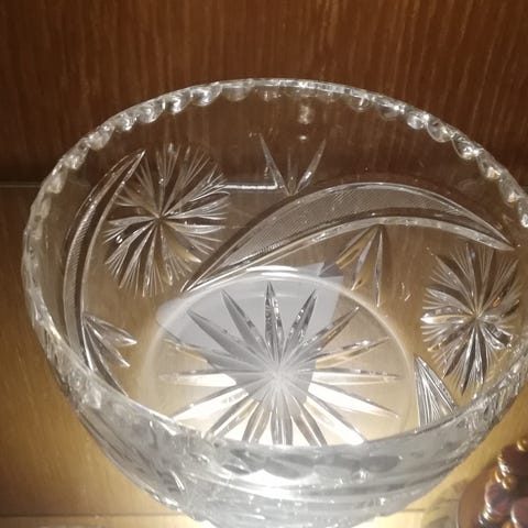 Selger vintage krystall is bøtte med mønster og hank i metall. Høyde 14 cm. Fin, som ny, aldri brukt, bare står i skapet som pynt. Følger med enkel isklype i metall som passer til bøtta. Pris 190 kr. Kan sendes mot porto med Post Nord