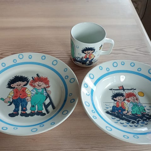 To krus og en asjett i serien "Mormor og de åtte ungene". Alle deler fremstår svært pene/lite brukt. Krusene har høyde 9 cm, diameter 8,5 cm. Asjetten har diameter 20,5 cm.