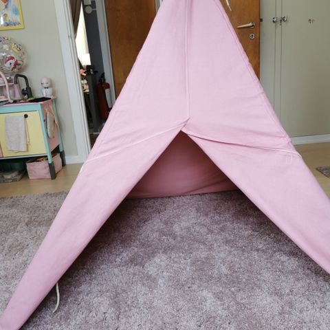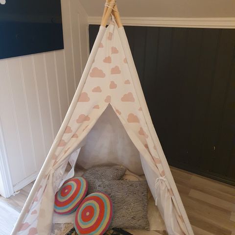 Barna har tegnet på baksiden (se bilde). Teltet kan vaskes, så vil tro det går bort i vask.